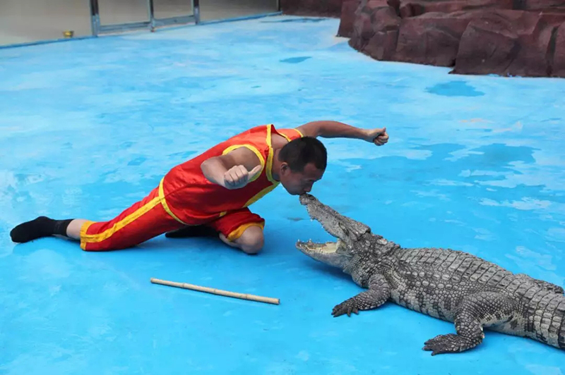 隨著馴獸師的一聲號(hào)令,各種動(dòng)物邁著矯健的步伐依次走過(guò)表演場(chǎng)地,不論是地上跑的,空中飛的,還是高矮胖瘦、溫順和兇猛的動(dòng)物都依次接受游客的檢閱。